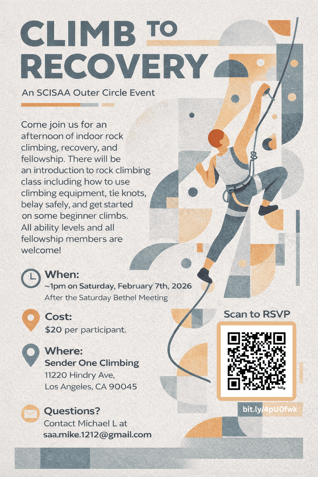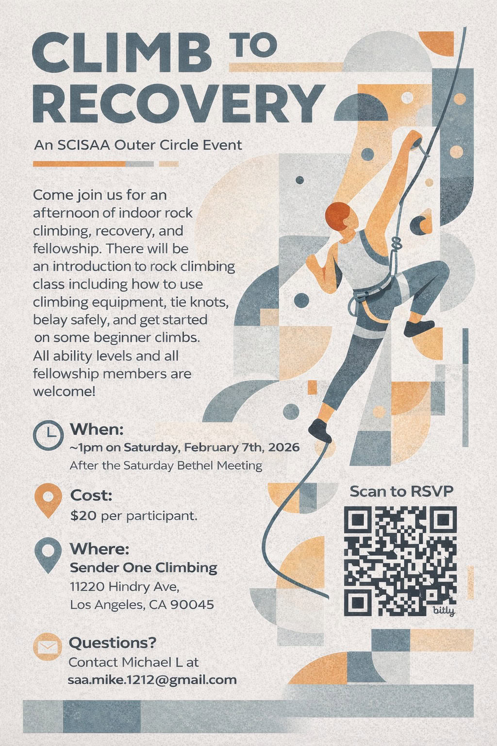 Come join us for an afternoon of indoor rock climbing, recovery, and fellowship. There will be an introduction to rock climbing class including how to use climbing equipment, tie knots, belay safely, and get started on some beginner climbs.